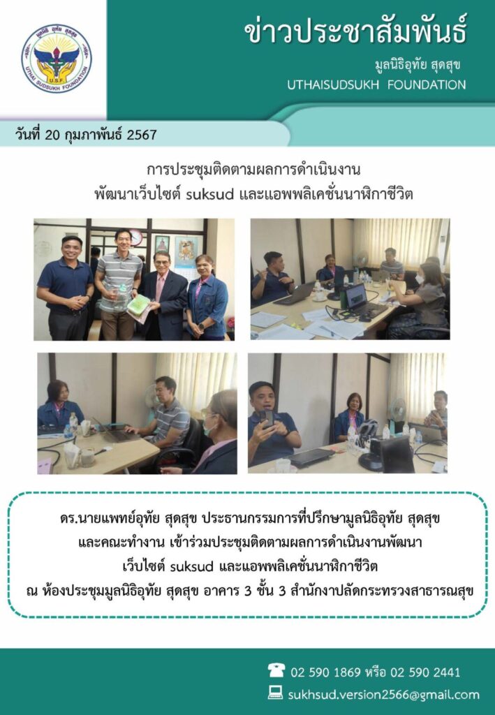 การประชุมติดตามผลการดำเนินงานพัฒนา เว็บไซต์ suksud และแอพพลิเคชั่นนาฬิกาชีวิต 20/02/2024 neeranoot rodthiang 0 จำนวนผู้เข้าชม : 89