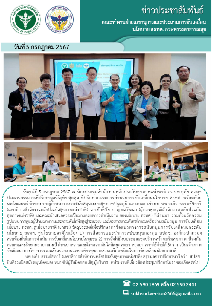 ดร.นพ.อุทัย สุดสุข ประธานกรรมการที่ปรึกษามูลนิธิอุทัย สุดสุข ที่ปรึกษากรรมการอำนวยการขับเคลื่อนนโยบาย สธทศ. พร้อมด้วย นพ.โกเมนทร์ ทิวทอง รองผู้อำนวยการกองสนับสนุนระบบสุขภาพปฐมภูมิ และคณะ เข้าพบ นพ.จเด็จ ธรรมธัชอารี (เลขาธิการสำนักงานหลักประกันสุขภาพแห่งชาติ) นพ.ศักดิ์ชัย กาญจนวัฒนา (ผู้ทรงคุณวุฒิสำนักงานหลักประกันสุขภาพแห่งชาติ)