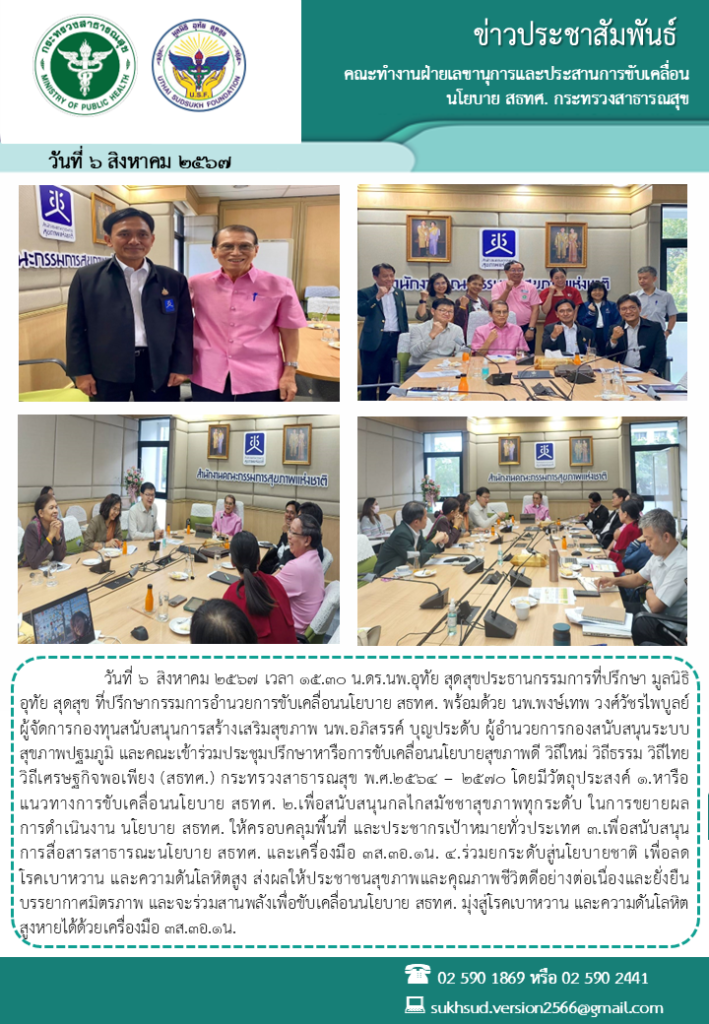 ดร.นพ.อุทัย สุดสุขประธานกรรมการที่ปรึกษา มูลนิธิอุทัย สุดสุข ที่ปรึกษากรรมการอำนวยการขับเคลื่อนนโยบาย สธทศ. พร้อมด้วย นพ.พงษ์เทพ วงศ์วัชรไพบูลย์ ผู้จัดการกองทุนสนับสนุนการสร้างเสริมสุขภาพ นพ.อภิสรรค์ บุญประดับ ผู้อำนวยการกองสนับสนุนระบบสุขภาพปฐมภูมิ และคณะเข้าร่วมประชุมปรึกษาหารือการขับเคลื่อนนโยบายสุขภาพดี วิถีใหม่ วิถีธรรม วิถีไทย วิถีเศรษฐกิจพอเพียง (สธทศ.) กระทรวงสาธารณสุข พ.ศ.2564 – 2570