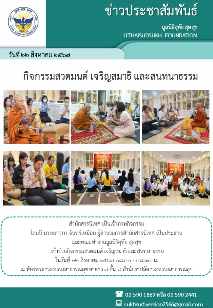 สำนักสารนิเทศ เป็นเจ้าภาพกิจกรรม โดยมี นางเยาวภา จันทร์เหมือน ผู้อำนวยการสำนักสารนิเทศ เป็นประธาน และคณะทำงานมูลนิธิอุทัย สุดสุข เข้าร่วมกิจกรรมสวดมนต์ เจริญสมาธิ และสนทนาธรรม 22/08/2024 neeranoot rodthiang 0 จำนวนผู้เข้าชม : 100