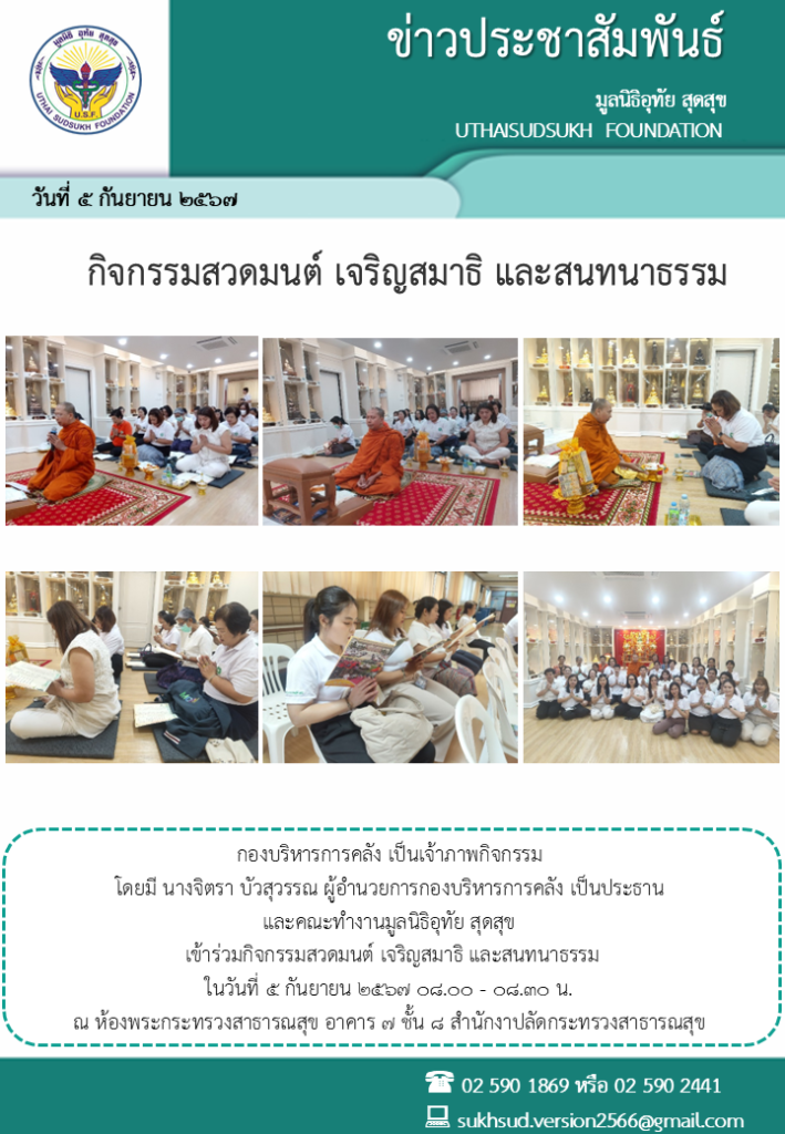 กองบริหารการคลัง เป็นเจ้าภาพกิจกรรม โดยมี นางจิตรา บัวสุวรรณ ผู้อำนวยการกองบริหารการคลัง เป็นประธาน และคณะทำงานมูลนิธิอุทัย สุดสุข เข้าร่วมกิจกรรมสวดมนต์ เจริญสมาธิ และสนทนาธรรม 05/09/2024 neeranoot rodthiang 0 จำนวนผู้เข้าชม : 75