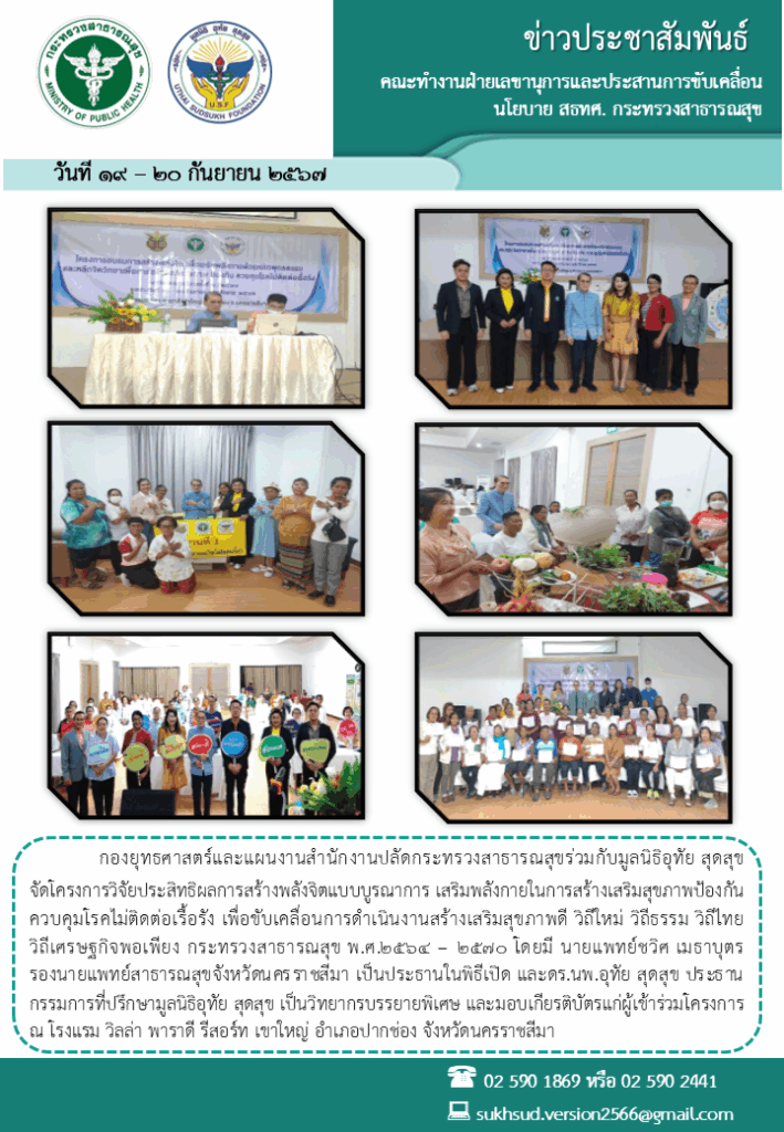 กองยุทธศาสตร์และแผนงานสำนักงานปลัดกระทรวงสาธารณสุข ร่วมกับมูลนิธิอุทัย สุดสุข จัดโครงการวิจัยประสิทธิผลการสร้างพลังจิตแบบบูรณาการ เสริมพลังกายในการสร้างเสริมสุขภาพป้องกันควบคุมโรคไม่ติดต่อเรื้อรัง 19/09/2024 neeranoot rodthiang 0 จำนวนผู้เข้าชม : 87