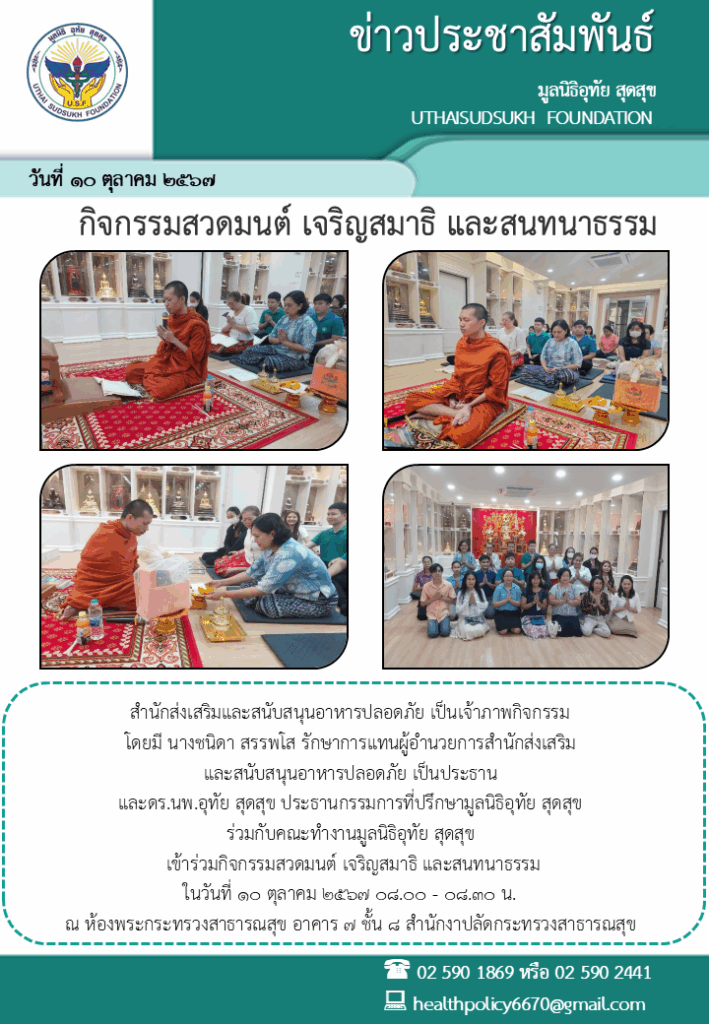สำนักส่งเสริมและสนับสนุนอาหารปลอดภัย เป็นเจ้าภาพกิจกรรม โดยมี นางชนิดา สรรพโส รักษาการแทนผู้อำนวยการสำนักส่งเสริมและสนับสนุนอาหารปลอดภัย เป็นประธาน และดร.นพ.อุทัย สุดสุข ประธานกรรมการที่ปรึกษามูลนิธิอุทัย สุดสุข ร่วมกับคณะทำงานมูลนิธิอุทัย สุดสุข เข้าร่วมกิจกรรมสวดมนต์ เจริญสมาธิ และสนทนาธรรม