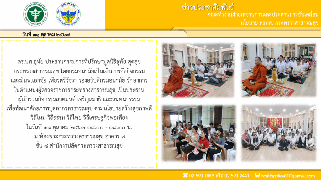 ดร.นพ.อุทัย สุดสุข ประธานกรรมการที่ปรึกษามูลนิธิอุทัย สุดสุขร่วมกับคณะทำงานมูลนิธิอุทัย สุดสุข เข้าร่วมกิจกรรมสวดมนต์ เจริญสมาธิ และสนทนาธรรมเพื่อพัฒนาศักยภาพบุคลากรสาธารณสุข ตามนโยบายสร้างสุขภาพดีวิถีใหม่ วิถีธรรม วิถีไทย วิถีเศรษฐกิจพอเพียง 31/10/2024 neeranoot rodthiang 0 จำนวนผู้เข้าชม : 73
