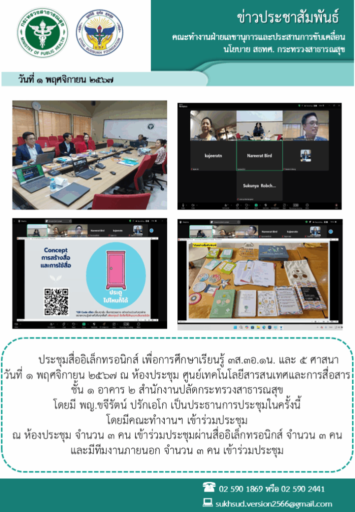 ประชุมสื่ออิเล็กทรอนิกส์ เพื่อการศึกษาเรียนรู้ 3ส.3อ.1น. และ 5 ศาสนาวันที่ 1 พฤศจิกายน 2567 ณ ห้องประชุม ศูนย์เทคโนโลยีสารสนเทศและการสื่อสารชั้น 1 อาคาร 2 สำนักงานปลัดกระทรวงสาธารณสุข โดยมี พญ.ขจีรัตน์ ปรักเอโก เป็นประธาน 01/11/2024 neeranoot rodthiang 0 จำนวนผู้เข้าชม : 79