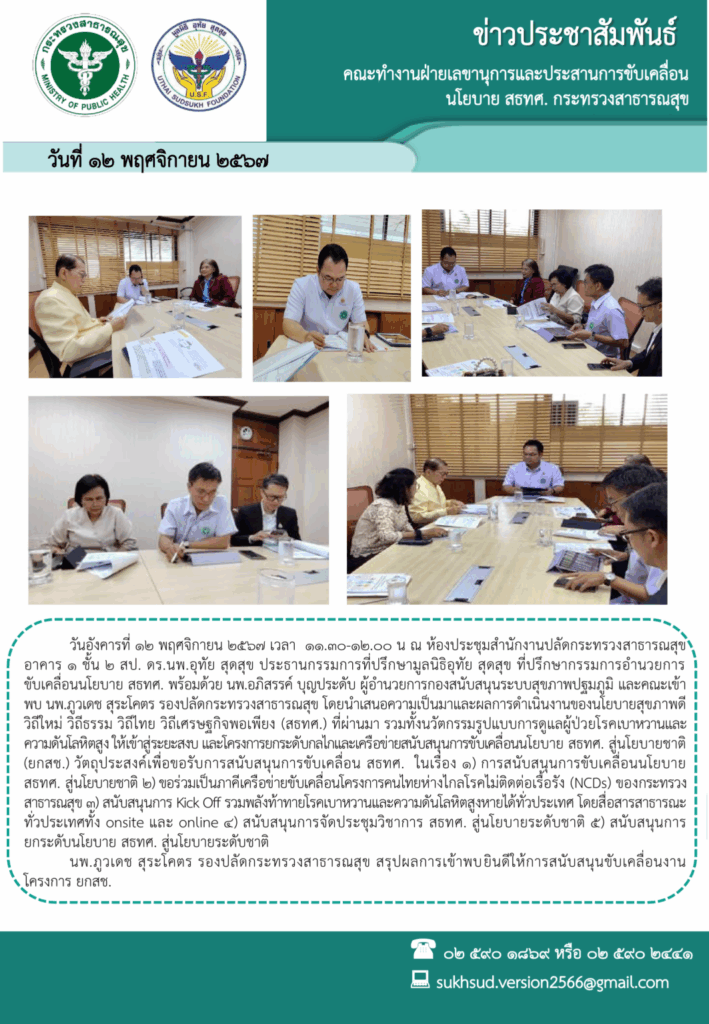 ดร.นพ.อุทัย สุดสุข ประธานกรรมการที่ปรึกษามูลนิธิอุทัย สุดสุข ที่ปรึกษากรรมการอำนวยการขับเคลื่อนนโยบาย สธทศ. พร้อมด้วย นพ.อภิสรรค์ บุญประดับ ผู้อำนวยการกองสนับสนุนระบบสุขภาพปฐมภูมิ และคณะเข้าพบ นพ.ภูวเดช สุระโคตร รองปลัดกระทรวงสาธารณสุข เพื่อขอรับการสนับสนุนการขับเคลื่อน สธทศ.